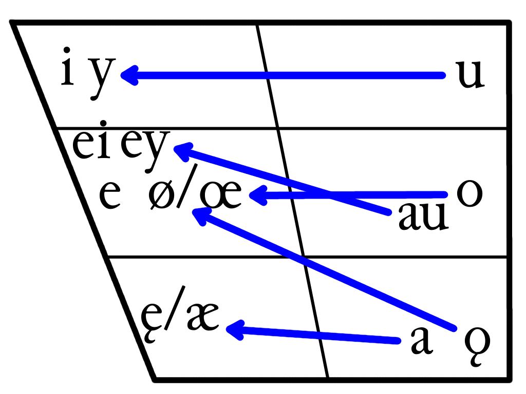 The above image is a vowel chart or vowel diagram: constituting a schematic display of the mouth, it charts whether a sound is produced with the mouth wide open (low in the diagram) or fairly close (high in the diagram), as well as whether the raised part of the tongue is more towards the front of the organ (left side of the diagram) or towards the back (right-hand side). Although it is customary to use phonemic notation in vowel diagrams, I have chosen to use the graphemes of Old Norse in the above representation, i.e. the letters as they were written. All these sounds had long counterparts which I have left out to avoid chaos, but I have written in æ and œ because they are the only vowels whose spelling (in the standard here represented) differs from their short counterparts beyond the addition of an acute accent. Remember: these letters represent reconstructed early Old Norse, not Modern Icelandic or even fourteenth-century Icelandic.